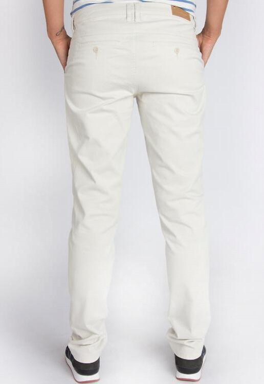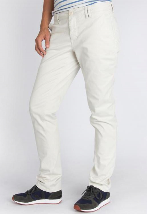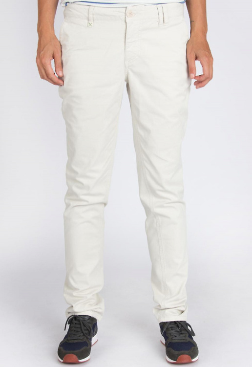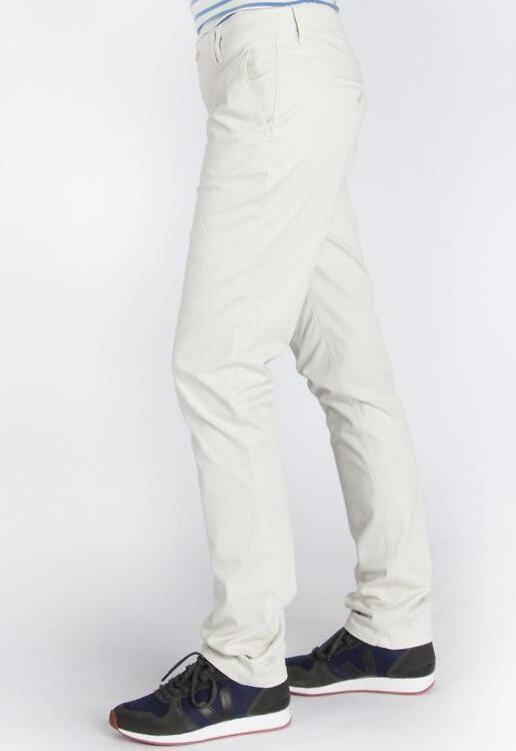 Beige-farbener Stoff, mit Reißverschluss und Patch aus recyceltem Papier.