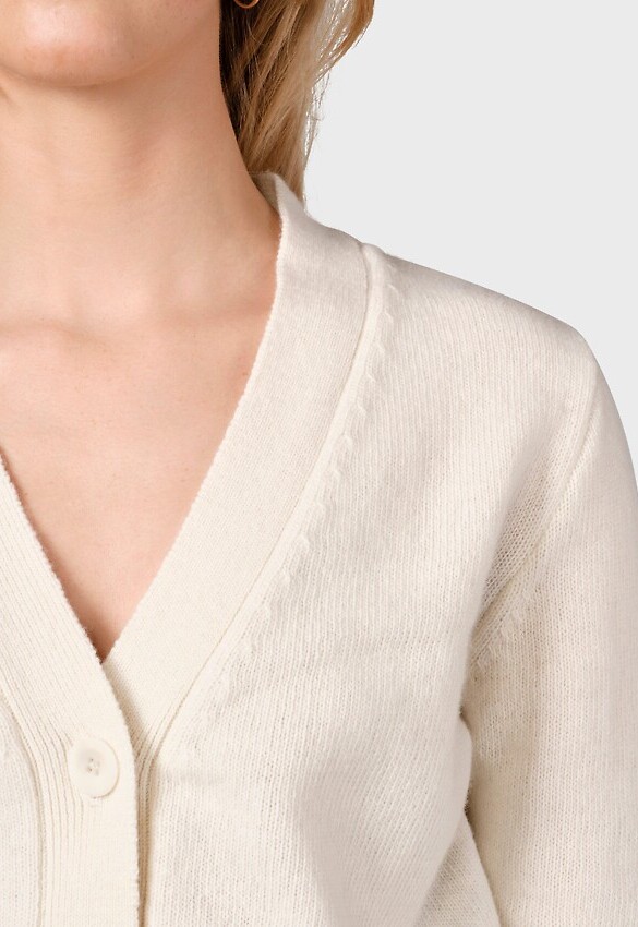 Wilma ist eine Strickjacke aus gebürsteter Merinowolle mit V-Ausschnitt, Knopfverschluss und breiten Rippstrickabschlüssen an Ärmeln und am Bund.