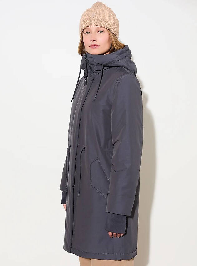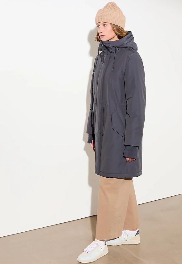Das Obermaterial ist fest gewebtes Material aus 59% Biobaumwolle und 41% recyceltem Nylon, von innen laminiert mit einer Membran aus Polyurethan. Somit ist die Jacke wind- und wasserdicht und  atmungsaktiv.