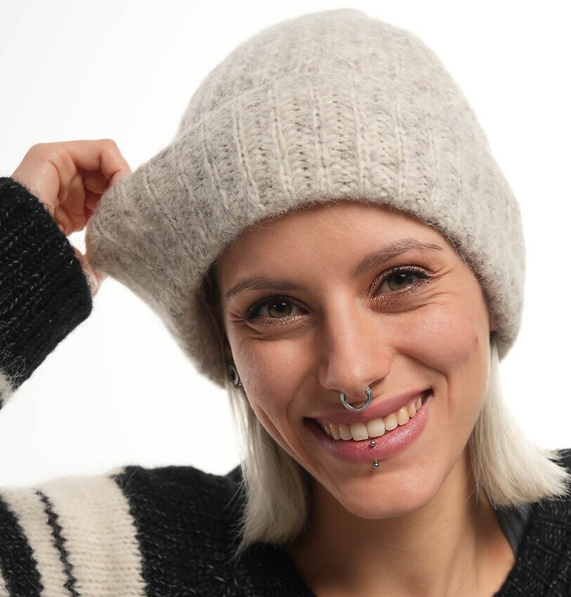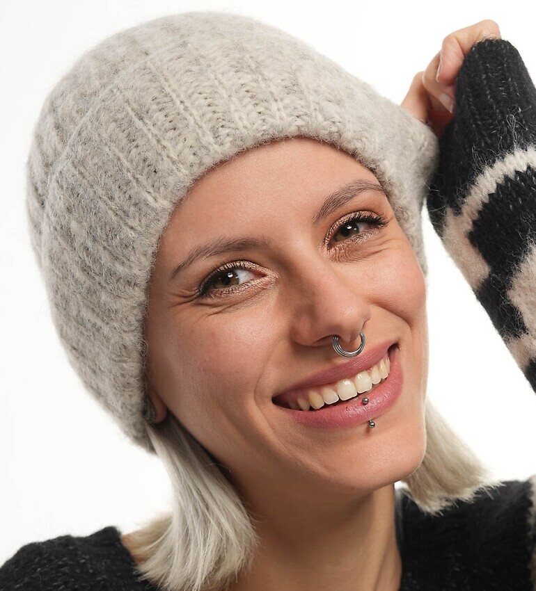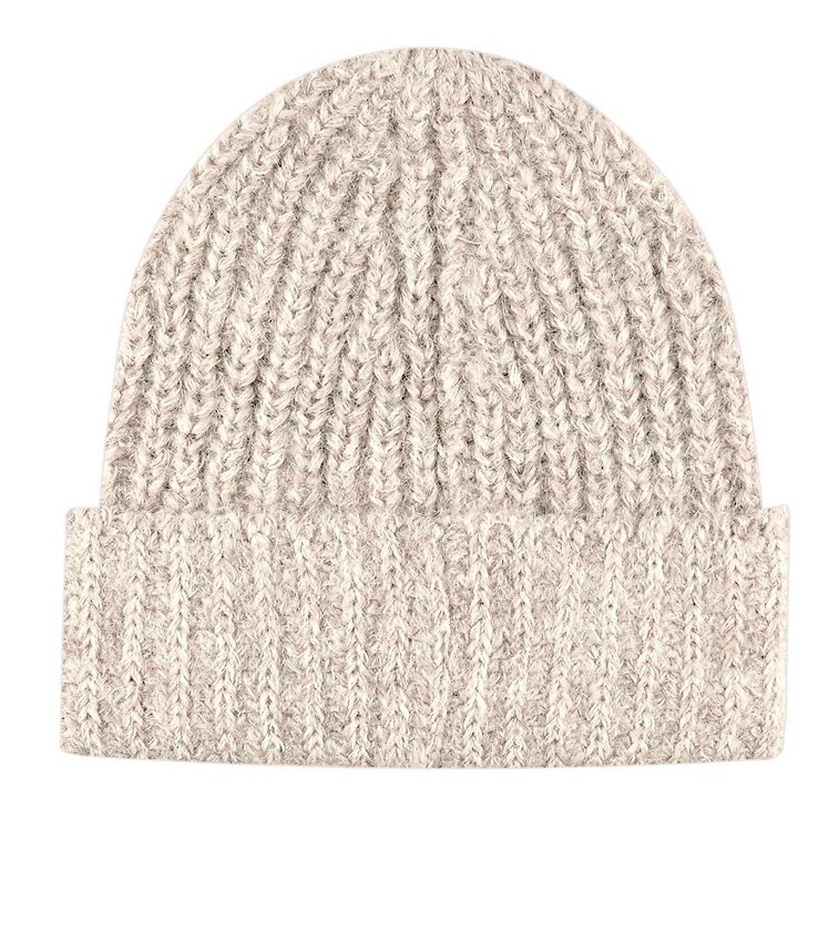 Softe Strick-Mütze aus meliertem Garn aus Baby-Alpaka-Wolle und Baumwolle.