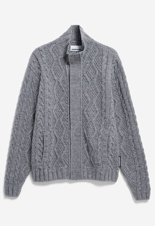 Wollstrickjacke aus grobem Zopfmusterstrick mit aufgesetzten Taschen, Reißverschluss und Stehkragen.