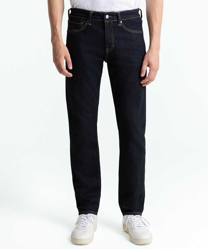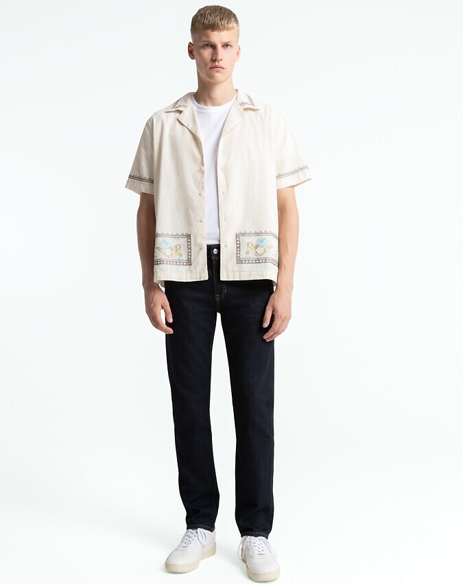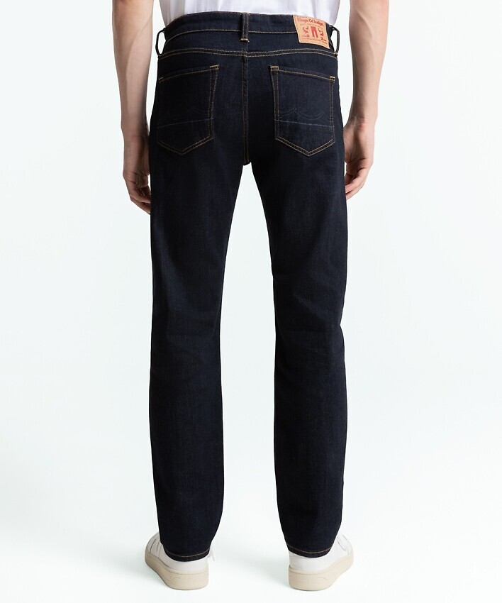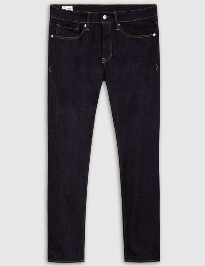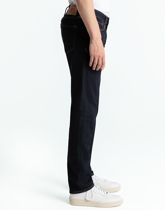 Ohne Auswaschungen und Crinkles, nur einmal vorgewaschen, daher verliert die Jeans bei den ersten Wäschen noch etwas Farbe.