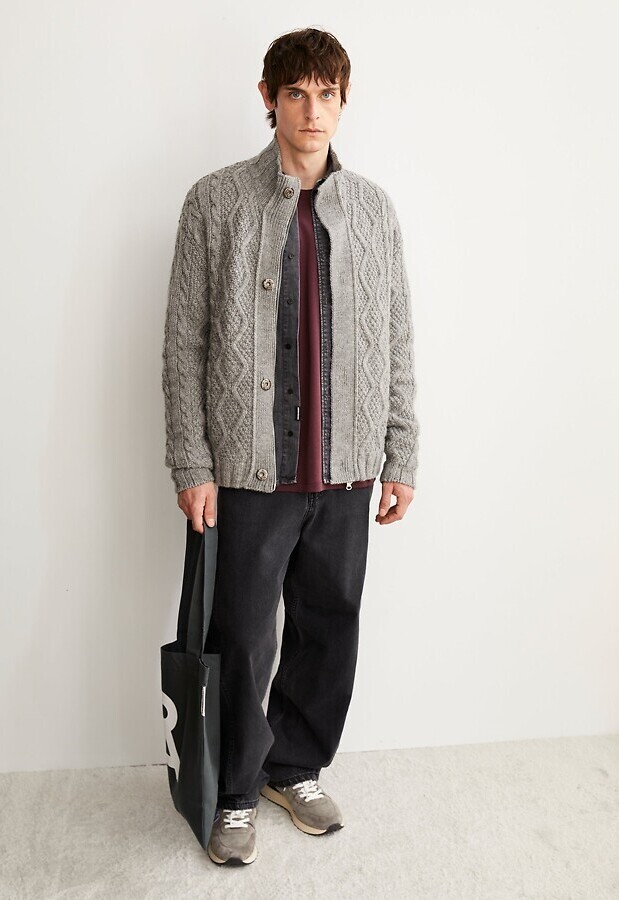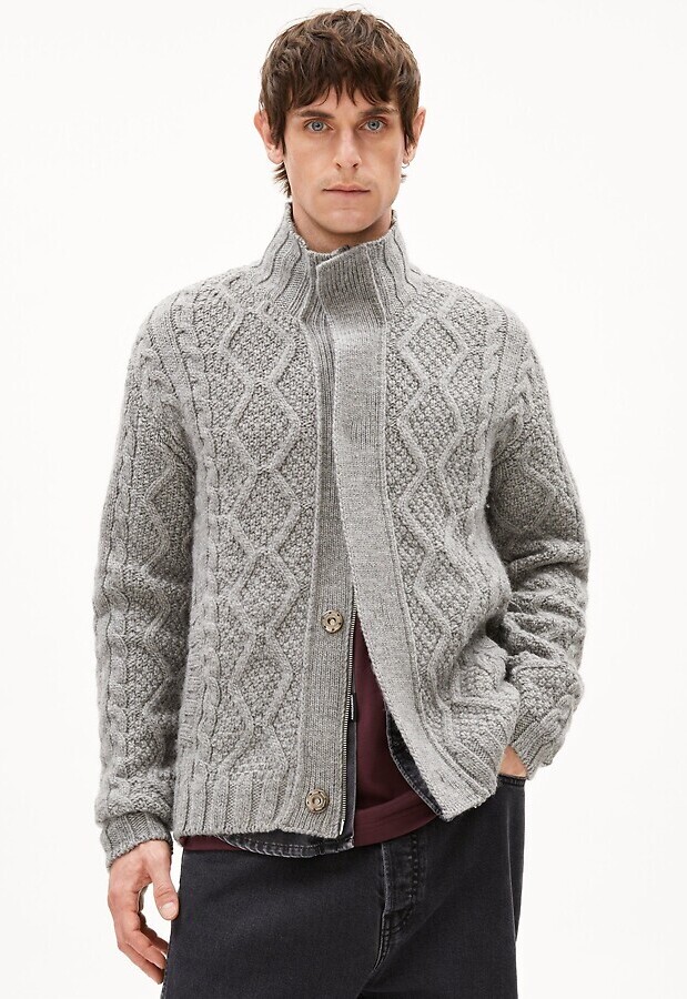 Wollstrickjacke aus grobem Zopfmusterstrick mit aufgesetzten Taschen, Reißverschluss und Stehkragen.