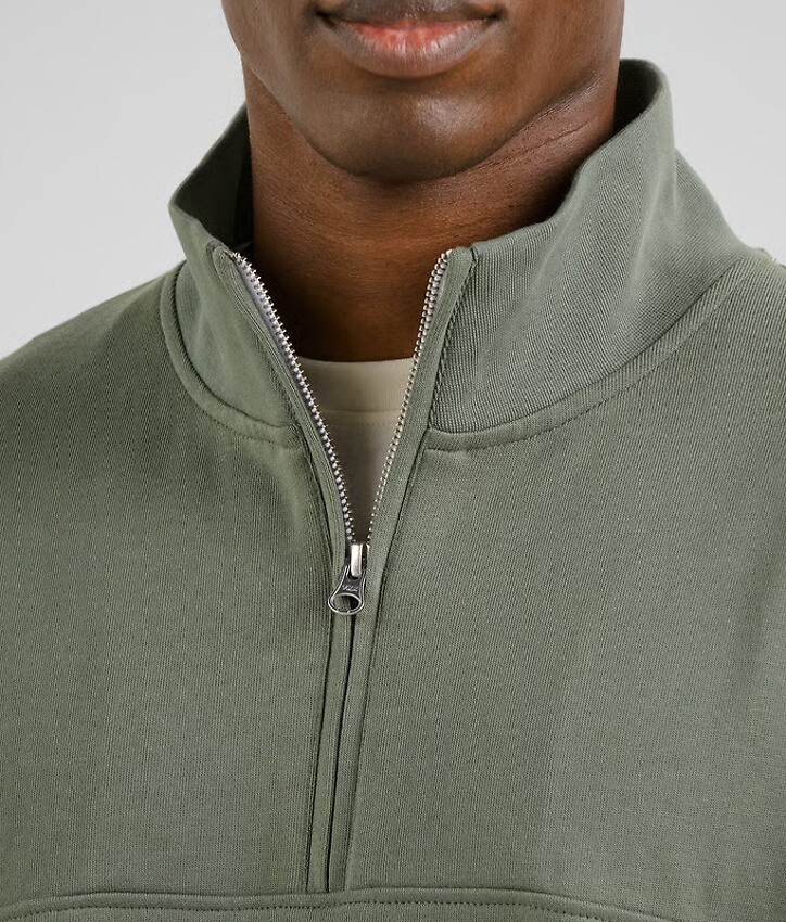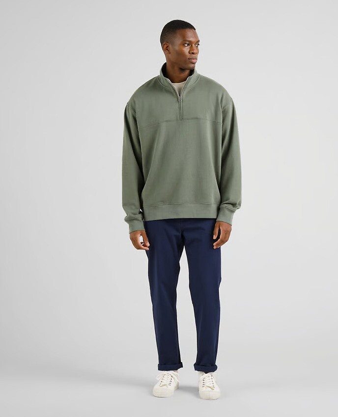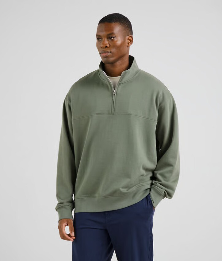 Locker geschnittener Half-Zip-Pullover mit schwererem Material und trockener Haptik für ein besonders luxuriöses Tragegefühl. Gefertigt aus einem speziell dicht gestrickten Garn, das eine intensivere Farbe verleiht.