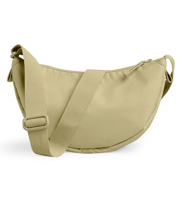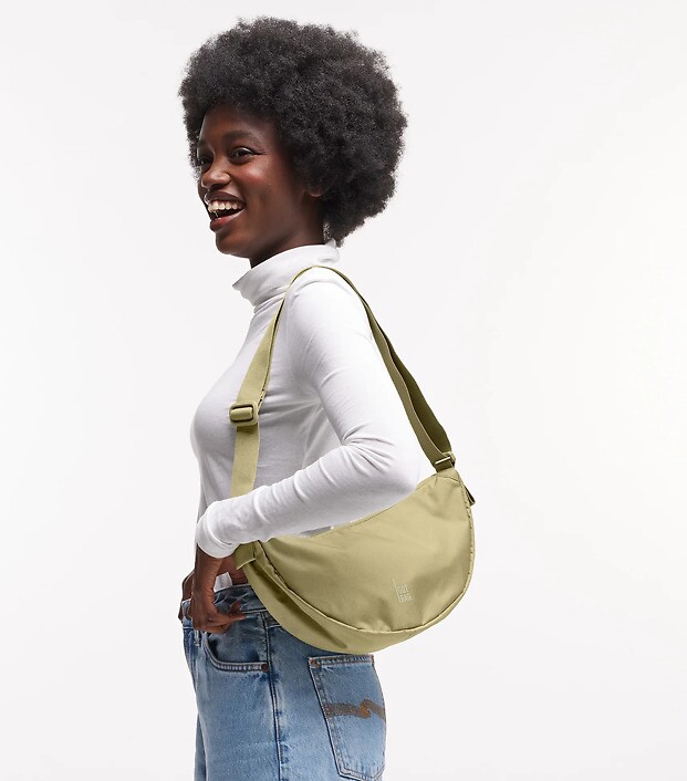 Wasserfeste Tasche mit verstellbarem Schulterriemen, runder Form und weichem Material.