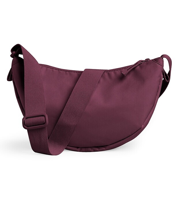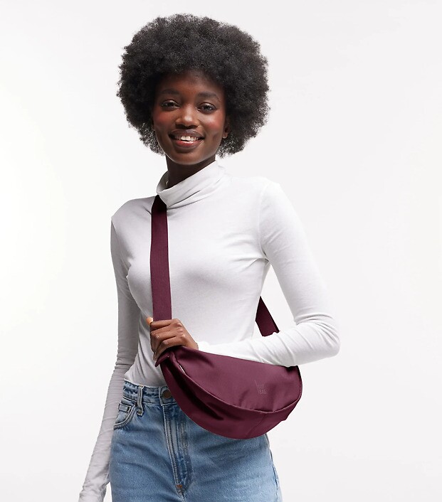 Wasserfeste Tasche mit verstellbarem Schulterriemen, runder Form und weichem Material.