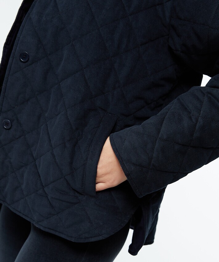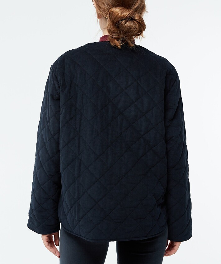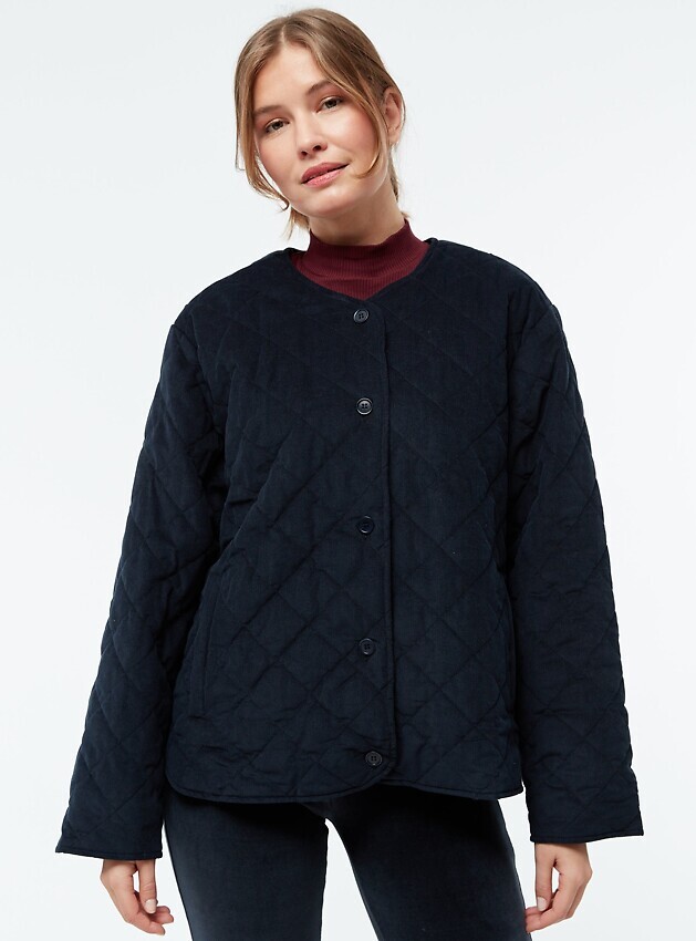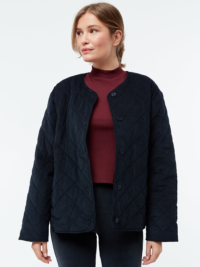 Übergangs-Jacke aus klassisch gestepptem Babycord aus Bio-Baumwolle in einem zeitgemäßen Schnitt mit Drucknknöpfen und einer leichter Fütterung (aus recycelter Polyesterwolle) auch für kühlere Tage.