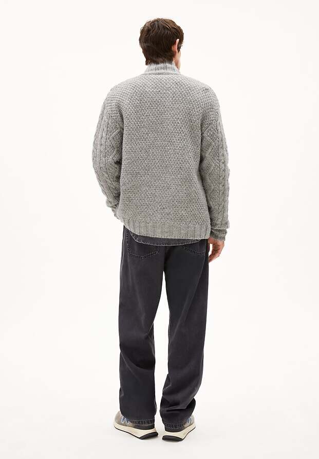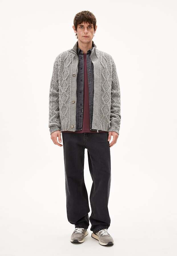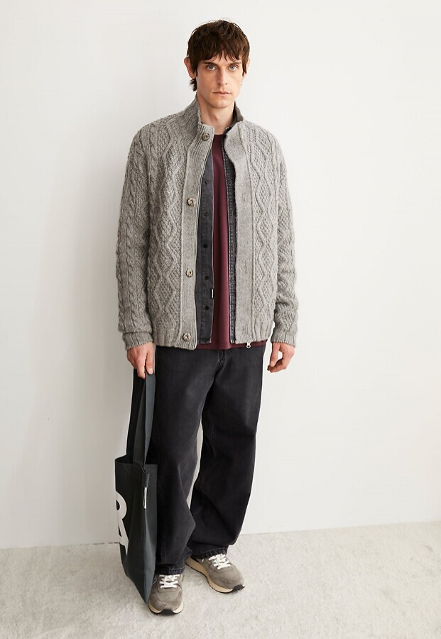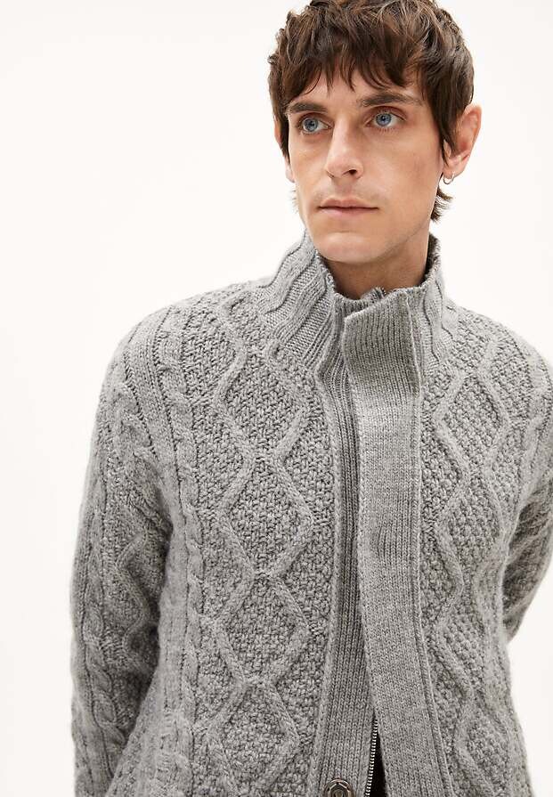 Wollstrickjacke aus grobem Zopfmusterstrick mit aufgesetzten Taschen, Reißverschluss und Stehkragen.