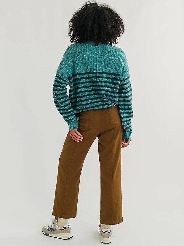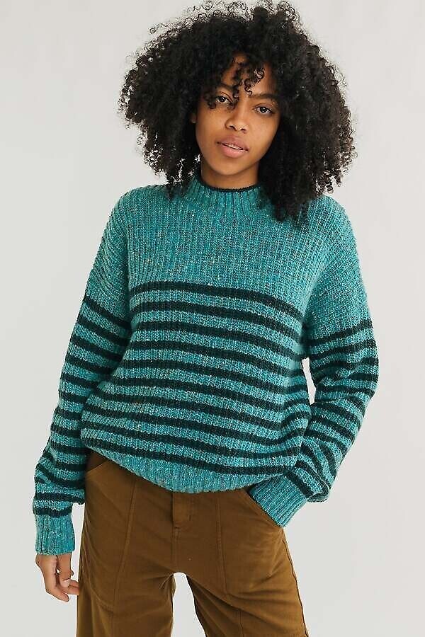 Gerippter Wollstrickpullover in schönem Türkisblau mit Streifen.