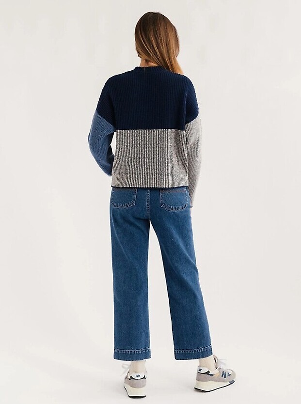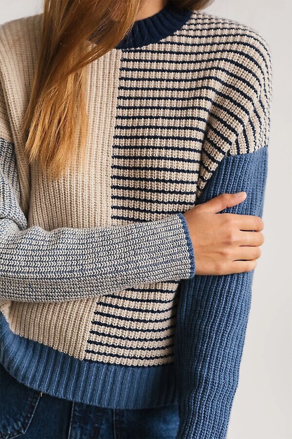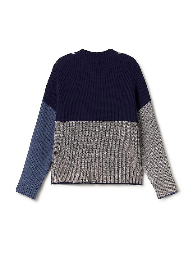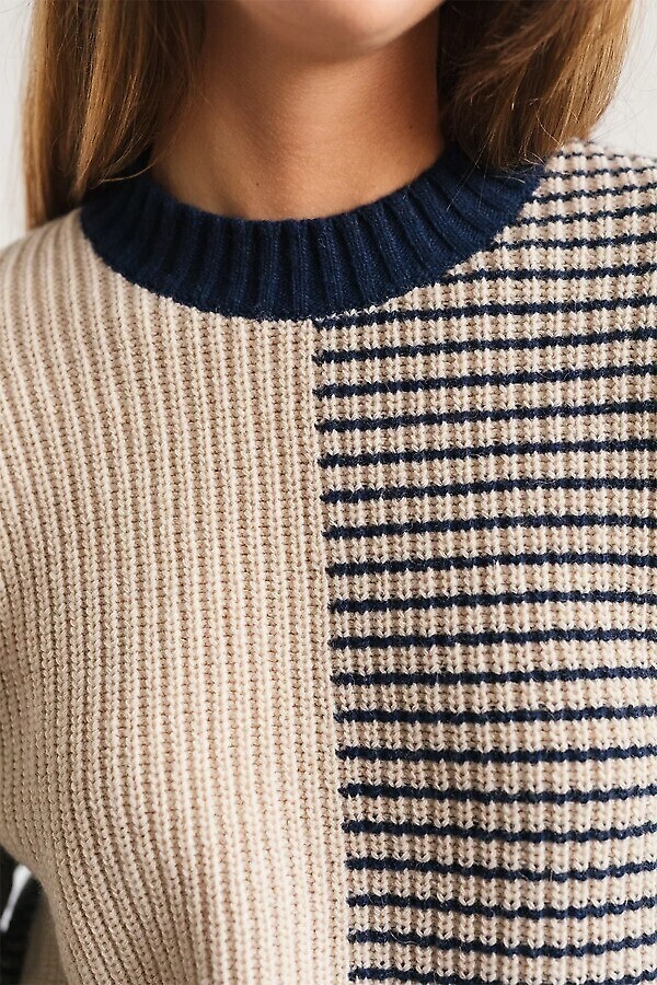 Gemütlicher Wollstrickpullover mit schönen Farbblöcken und kontrastierenden Linien.