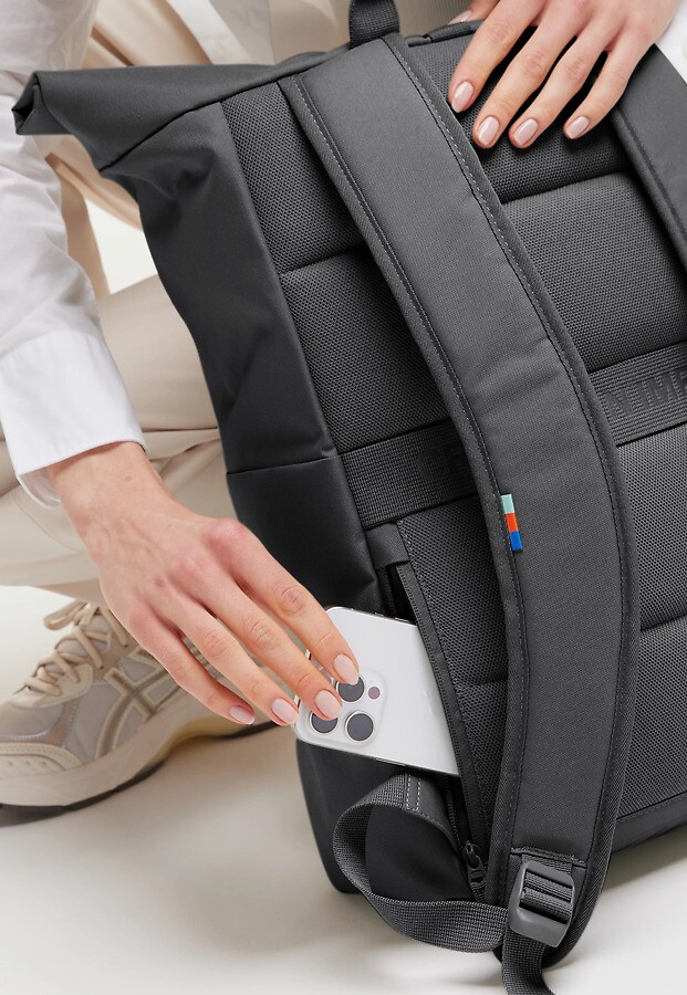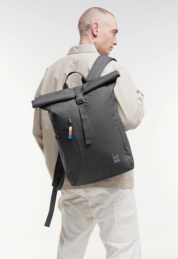 Leichte Version des Klassikers aus weichem, wasserabweisendem Material mit Reißverschluss-Rolltop und seitlichen Flaschenfächern.