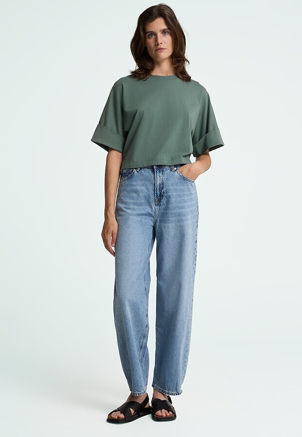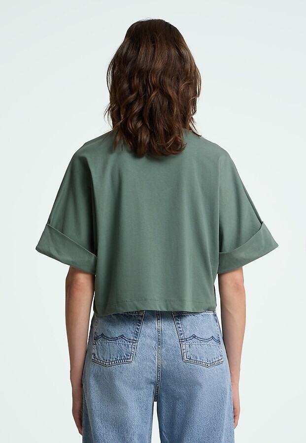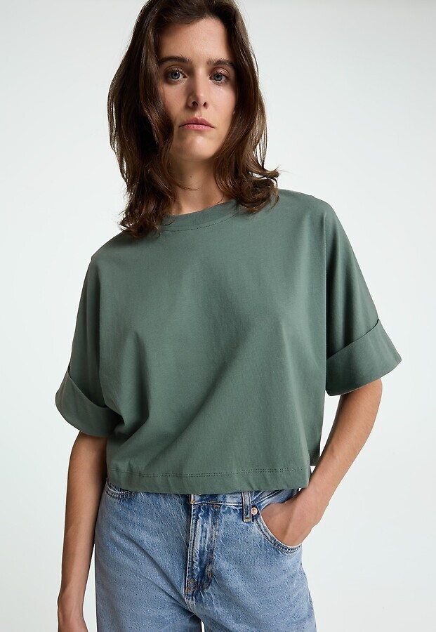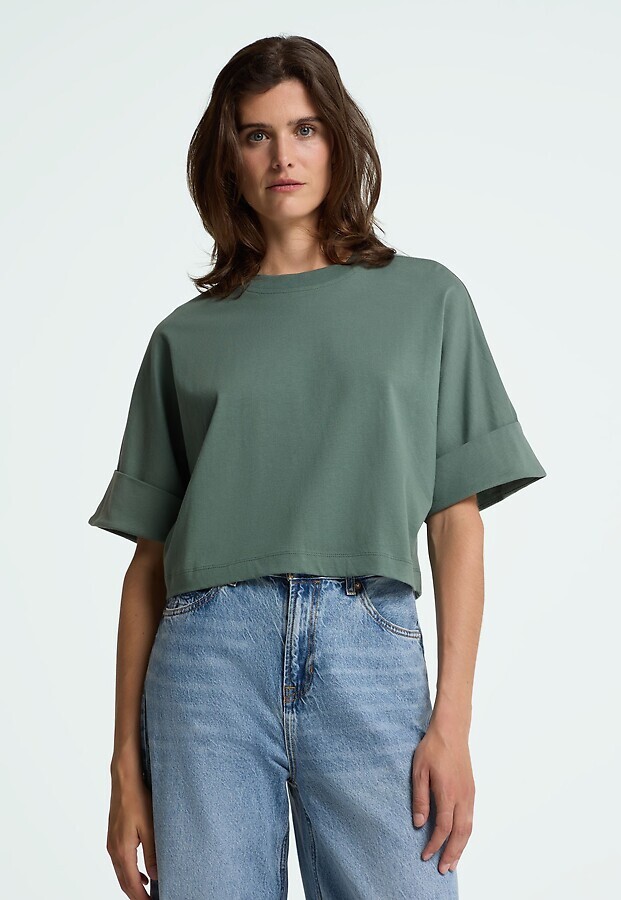 Kurzärmeliges Damen-T-Shirt mit einem Oversized-Crop-Fit und abfallenden Schultern. Body und Ärmel sind aus einem einzigen Stück Stoff geschnitten, was Nähte reduziert und ein weicheres Gefühl sowie mehr Komfort bietet. Weite Armöffnungen, großzügige Ärmelaufschläge und ein gerippter Ausschnitt sorgen für Struktur, während der leichte Stoff einen weichen Fall und Bewegungsfreiheit bietet.