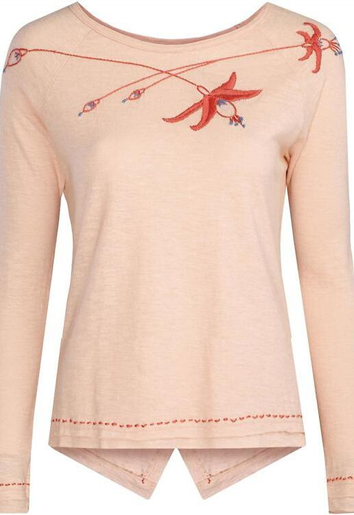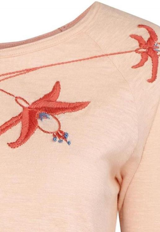 Schöne Blumen-Stickerei vorne bis zu den Schultern.